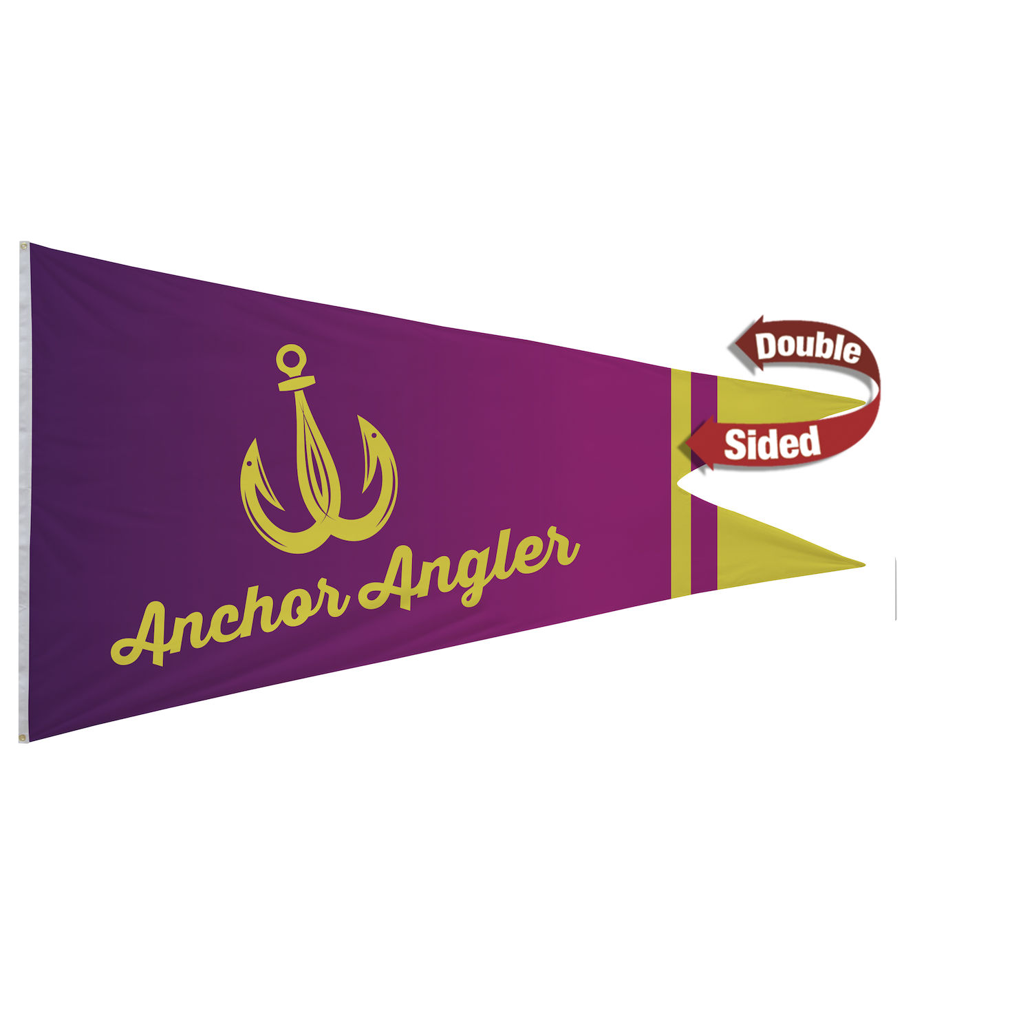 This brilliantly colored, custom printed burgee flag will look great wherever it’s displayed! A popular shape with boats, marinas or any nautical themed activity, each flag is made of 200 denier nylon, measures 6′ x 10′ and is great for both indoor and outdoor use. Each flag is finished with a canvas heading and brass grommets. It also has two rows of stitching on top, bottom and fly end. It can be customized with double-sided graphics – two layers are sewn together with a block-out liner in between.